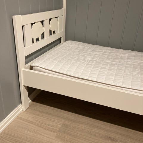 Fin liten barneseng 160cm lang, 70 cm bred. Hel og pen, men finnes sikkert noen bruksmerker her og der.