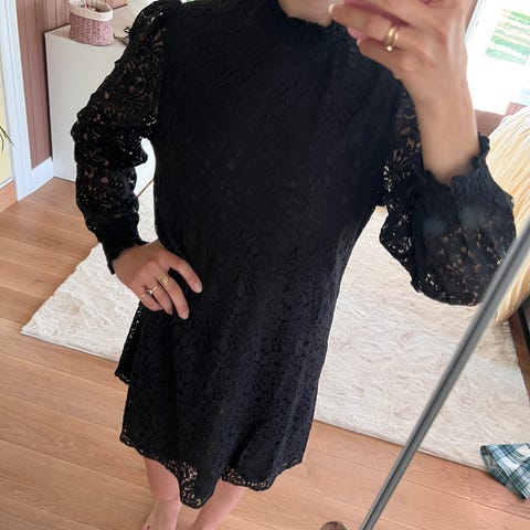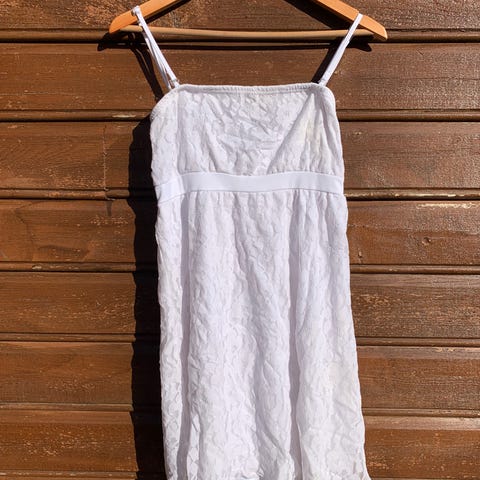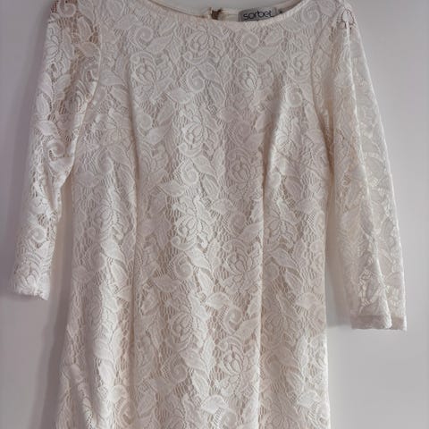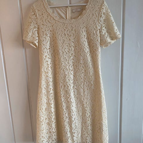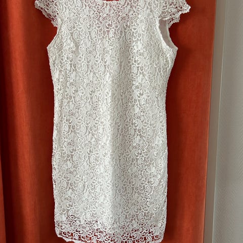 Nydelig blondekjole som kun ble brukt en gang under graviditet og derfor er for stor nå. Blondedelen henger nedfor innerkjolen, se bildene. Nydelige detaljer!