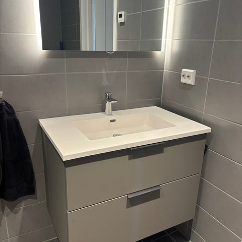 Baderomsinnredning med servant og speil i hvit utførelse. To skuffer med metallhåndtak under servant for oppbevaring. Speil med integrert belysning montert på vegg over servant. Passer til baderom med standard oppsett. Størrelse 80 x 50 cm. Jeg har 2 stk. som kan kjøpes. Nye 2023. Ingen skader. Planlegger nye møbler våren 2026. Dato for henting av innredningen ser ut til å bli torsdag 26. februar. Så selges først da, men sjekker nå om noen er interessert.