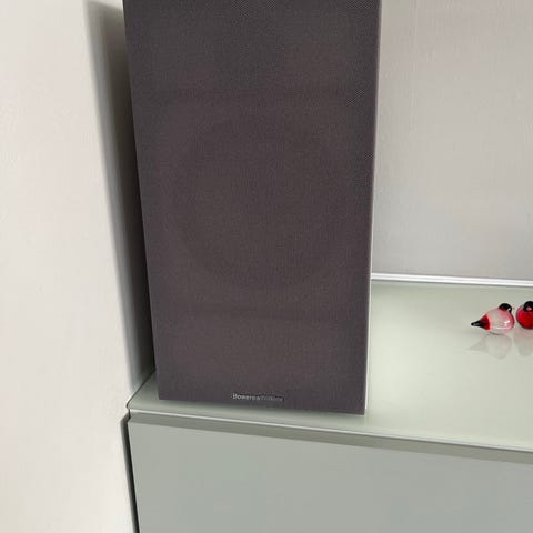 Bowers & Wilkins høyttaler med svart stofftrekk og kontrollpanel på toppen. Designet for lydavspilling med fokus på kvalitet og brukervennlighet.