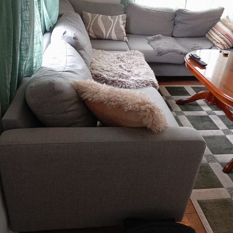 godt brukt hjørnesofa . farge lilla , et par flekker