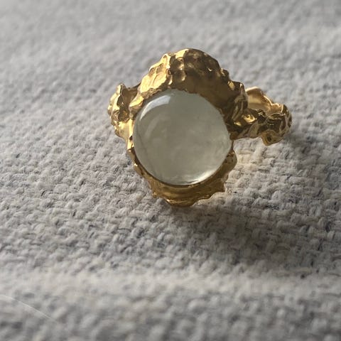 Ubrukt ring fra Maanesten i str 57. Gudinne / gudinne ring i gullforgylt sølv med lys agat. Materialer: 925 sterlingsølv belagt med 18K gull. Blonde agat. Selges pga feil størrelse til meg. Eventuelt byttes mot samme ring i str 55 eller 59.