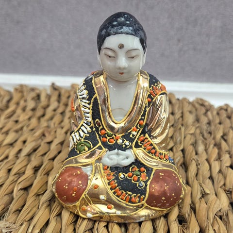Figuren er i en sittende meditasjonsstilling, kjent som Dhyana Mudra, med hendene i fanget, høyre hånd over venstre, og håndflatene vendt oppover.