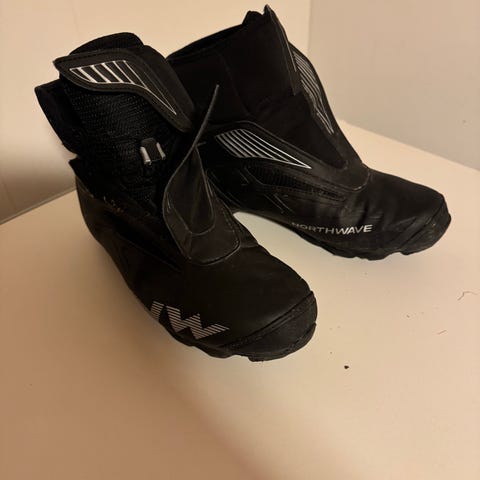 Diadora R2+ sykkelsko i størrelse 43. Skoene har borrelås og spenne for justering, egnet for sykling. Fargen er svart med noen hvite detaljer.