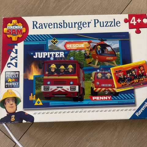 Ravensburger Brannmann Sam puslespill med to puslespill, hver med 24 brikker. Egnet for barn fra 3 år og oppover. Motiver med Brannmann Sam-tema i fargerik design.