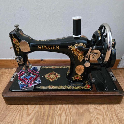 Symaskinen har et klassisk, antikt utseende med dekorative gull- og rødfargede detaljer på en svart base. Den drives manuelt ved hjelp av en håndveiv på høyre side. Laget av metall og har en spole av tråd montert på toppen. Designet for barn eller som en miniatyr samleobjekt. Lignende modeller ble populære på slutten av 1800-tallet og begynnelsen av 1900-tallet.