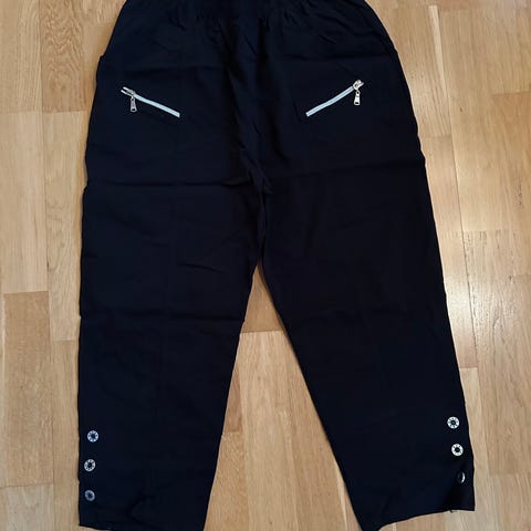 Svart med lyse striper. Hel lengde 76 cm, benlengde 49 cm. 97 % polyester, 3 % elastin. Samsender gjerne.