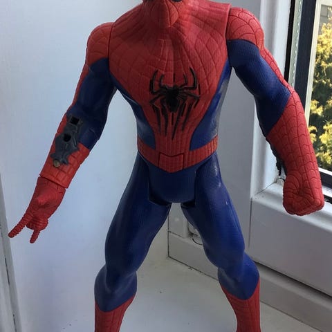 Marvel Spider-Man actionfigur med utskiftbare deler inkludert ekstra hender, masker og nettvinger. Figuren er laget av plast og har detaljer i rødt og blått. Passer for samlere og barn som liker Spider-Man.