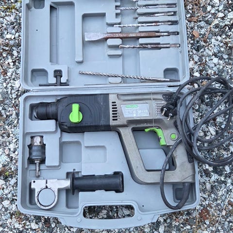 Verktøyet er brukt, men komplett med etui, ekstra meisler/bor, og manual.