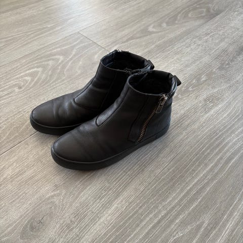 Vagabond sko i størrelse 37. Skoene er svarte og har glidelås på innsiden for enkel på- og avkledning. Materialet er semsket skinn.