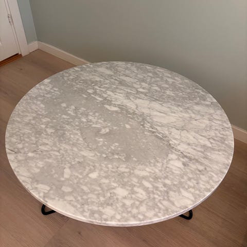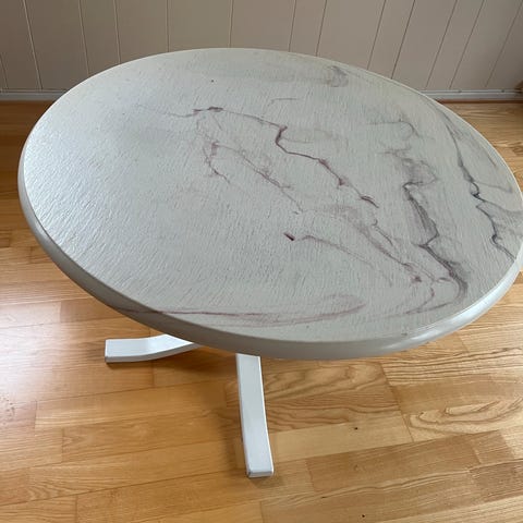 Marmorert blank topp i Epoxy og hvitmalt solid understell av treverk. Laget av kunstner.