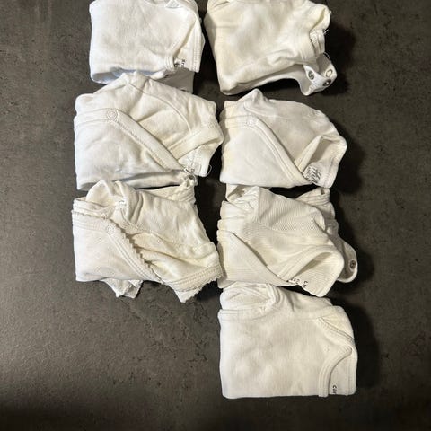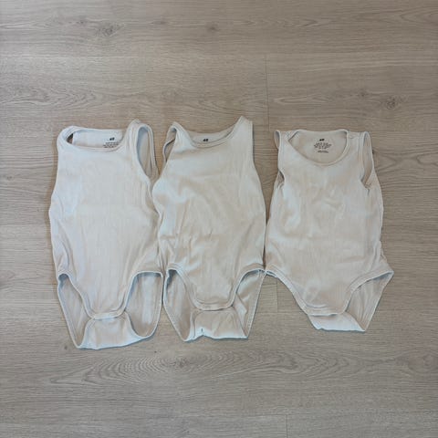 6stk H&M bodyer i størrelse 92, hvit farge, unisex. Pent brukt. Tre med lange ermer, to med korte ermer og en uten ermer. Se bilder for detaljer.