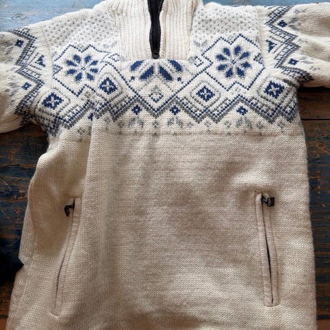 Dale of Norway genser i størrelse M, laget av ull. Genseren har tradisjonelt norsk mønster i hvitt med detaljer i rødt og svart. Passer for kvinner.