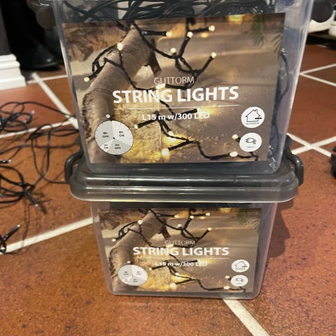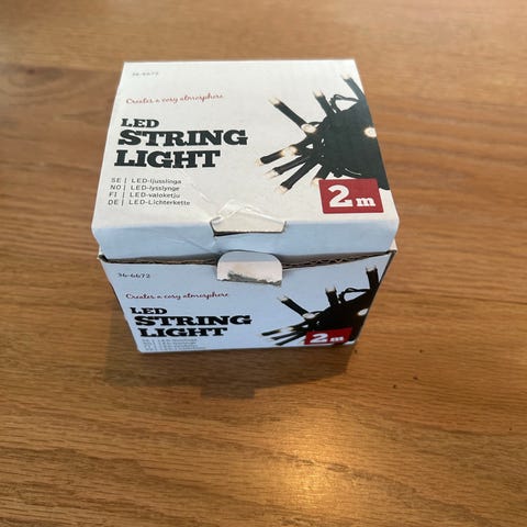 10 meter, 200 ledlys, varmhvit, svart kabel, ubrukt - 100 kr