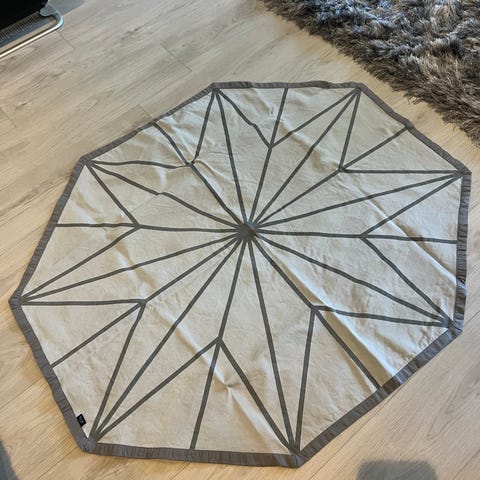 juletreteppe cm fra Ferm Living er en varm og grafisk detalj som løfter juledekking og pynting. Laget i 100% bomull med et mønster bygget på rene geometriske former. har fått noen flekker og krymper under vask, blitt litt mer oval i formen enn opprinnelig 120 cm diameter Se bilder. Selges derfor billig.