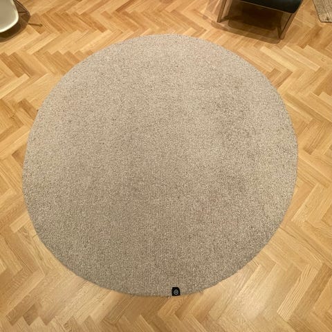 Pent brukt og rent kvalitetsteppe. Det er 200cm i diameter og er ensfarget blått. Det går fint med robotstøvsuger.