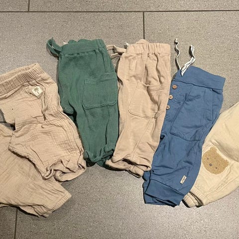 3 bukser, 1 hjemmestrikket ullbukse, 1 strømpebukse og 1 shorts. Diverse merker, ingen skader.