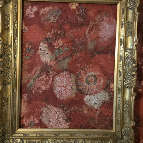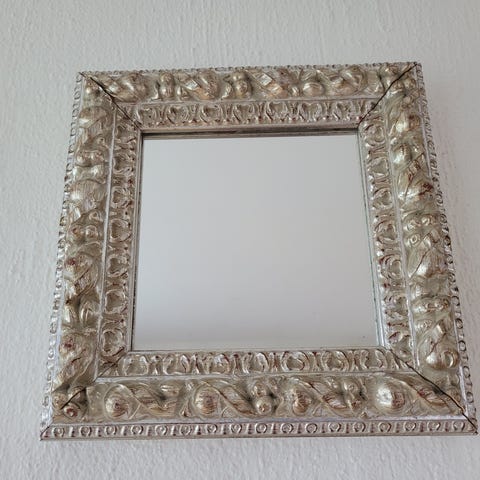 Mørk brun ramme med dekorative gullfargede/messingfargede aksenter og utskjæringer.
