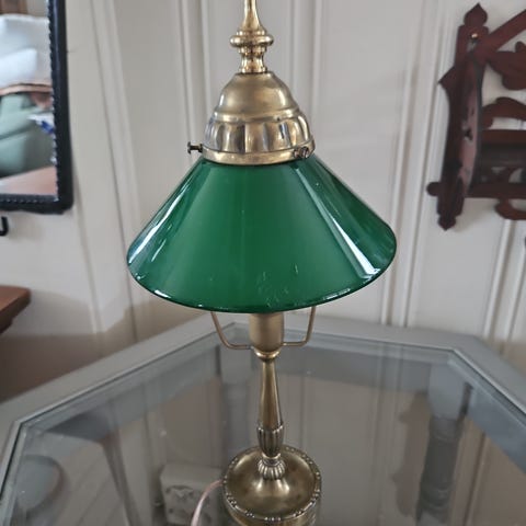 Denne grønne glass skjermen sitter bare løst på uten feste og kan følge med hvis ønskelig. Er flott med vanlig skjerm også men jeg har brukt den som vinduslampe så derfor denne skjermen