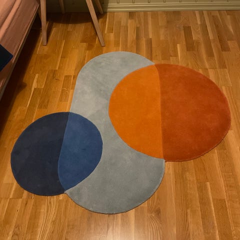 IKEA Barbro Barnerom teppe med fargerike sirkler i rosa, rød og grønn på blå bakgrunn. Passer til barnerom og gir et mykt underlag.