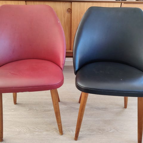 Stolen med rødt sete har sprukket kryssfiner. Regner med at det kan limes. Se bilde