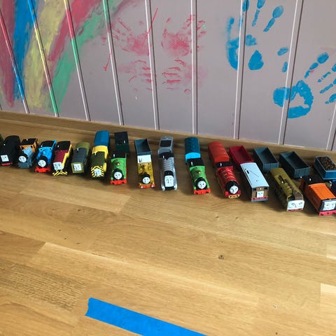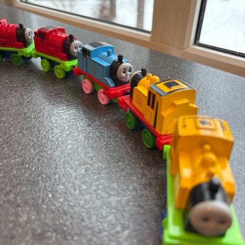 Thomas, Percy, Annie, Clarabel, Stanley, Dart, Jack, Rickety, Philip, Monty, brannbil, chicken car, Stasjonsmesteren og et juletre