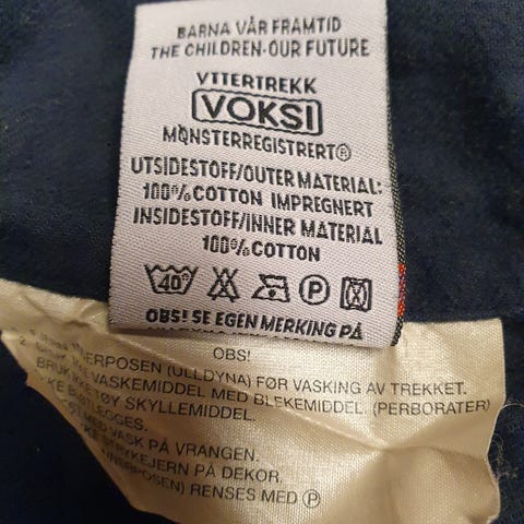 Falmet etikett ellers veldig pen i stoffet.