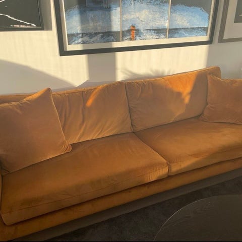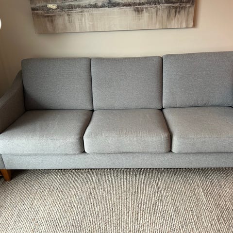 Sofaen ble spesialbestilt etter mål fra Møbelringen i 2016. Den er fortsatt fin og god å sitte i. Den er i 3 deler. Den kostet ny ca kr 20 000.-