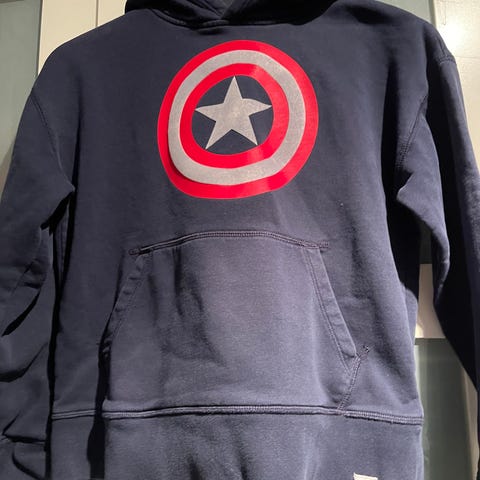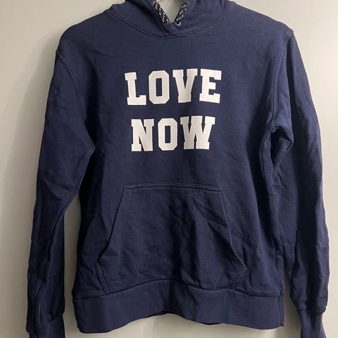 Gina Tricot mørk blå hettegenser med sølv glitter skrift/detaljer str 146/152. Litt slapp i kanten nederst og litt dempet i fargen men ellers pent brukt og pen genser.