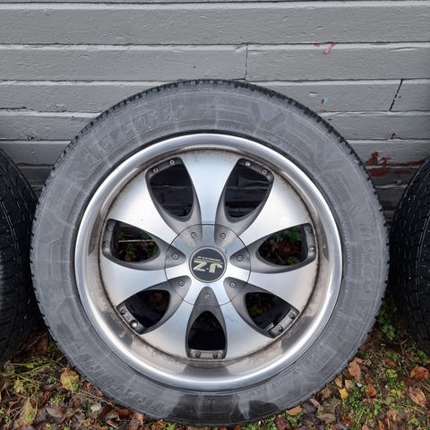 Lite brukt helårsdekk på gammel felg, 4 stk. Mye dekk igjen. Tatt i bruk 2021, kjørt 8-9 tusen km