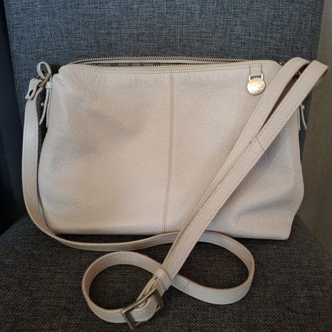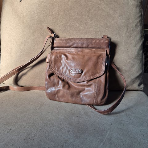 Clutch fra Maanii by Adax selges kr 100. Lys brunt skinn. Størrelse 19x32 cm.