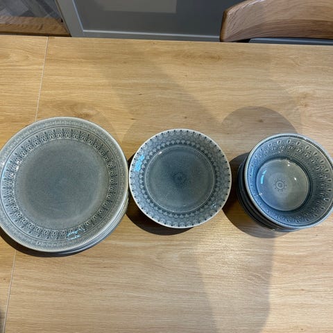 Servise fra Home & Cottage med fiskemotiv selges. Inkluderer tallerkener og boller med dekorative fiskedesign i blå og hvit farge.