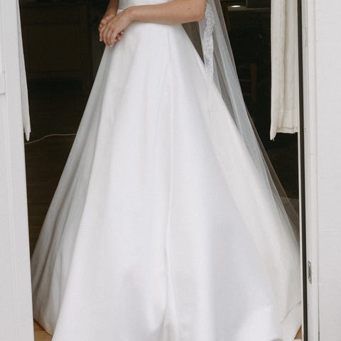 Selger denne nydelige Pronovias Keoni-brudekjolen, brukt kun én gang i mitt eget bryllup. Kjolen er i størrelse UK 12, men er sydd inn i midjen og lagt opp av skredder. Ett lag med tyll er også tatt ut. Tilsvarer ca. str. M. Jeg er 176 cm og brukte 8 cm hæler på bryllupsdagen.