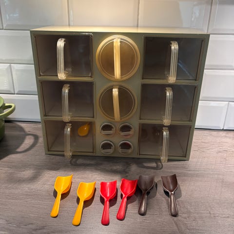 Søkeord: Antikvitet keramikkrukker 1950-talls mid century gamme vegghylle trehylle melhylle kjøkkenhylle