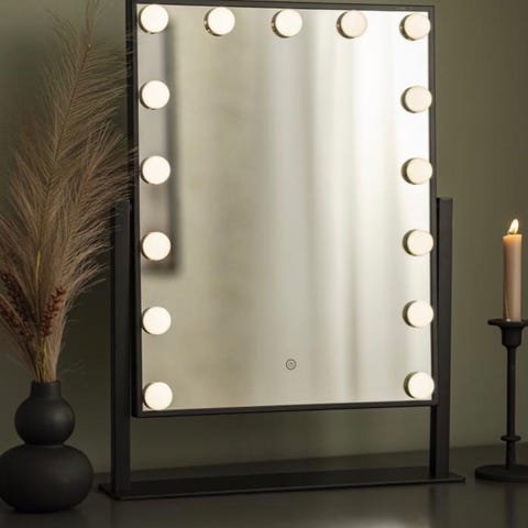 IKEA sminkespeil med integrerte lysarmaturer. Speilet har en kvadratisk form og hvit ramme. Passer til bruk på sminkebord eller i baderom for bedre belysning ved påføring av sminke.