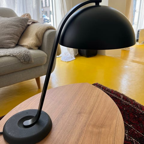 Sort lampe 68 cm høy, kuppel er 32 cm diameter.