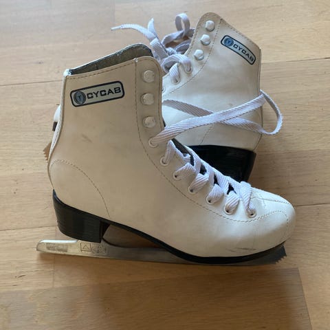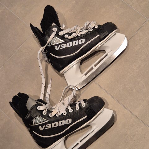CC M Ishockeyskøyter for barn i størrelse 35. Skøytene er svarte med hvite detaljer ,