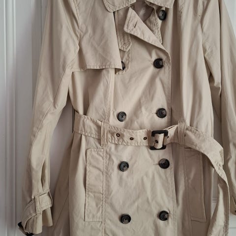 Cubus Annet yttertøy for kvinner i størrelse M. Jakken er beige og laget av bomullsmateriale. Den har doble knapper og belte i livet, med klassisk trenchcoat-design.