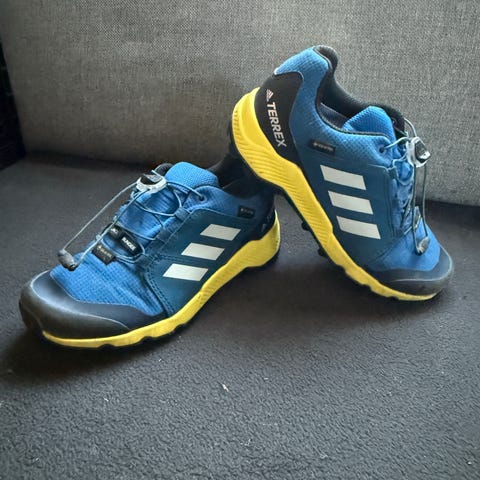 Adidas Gore-Tex barnesko for gutt i størrelse 20. Skoene er blå med svarte og gule detaljer. Materialet inkluderer Gore-Tex, som gir vanntetthet og pusteevne. Egnet for utendørs bruk og gir god beskyttelse og komfort for barnets føtter.