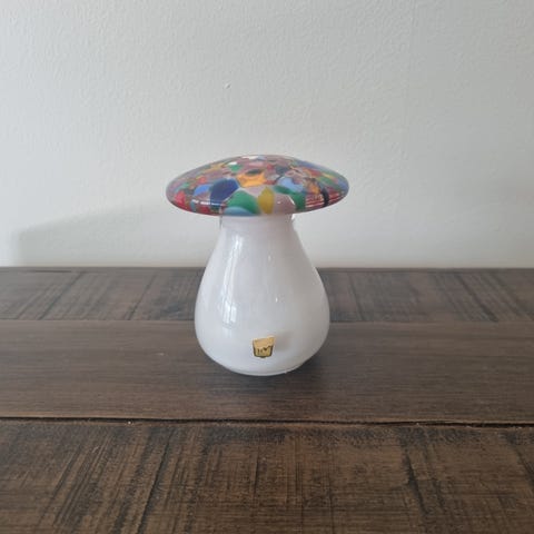 Dekorativ sopp av glass, antagelig fra Hadeland eller Magnor. Ca 7 cm høy og 6,5 cm Ø.