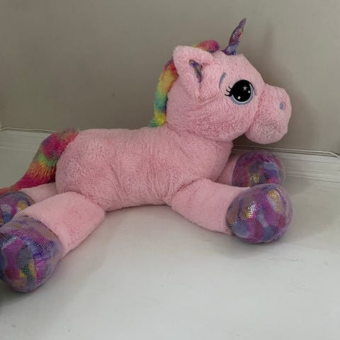 Bamse kosedyr i form av en rosa enhjørning med flerfargede detaljer og en lilla gris med stjerner og enhjørningshorn. Egnet som lek eller dekorasjon for barn.