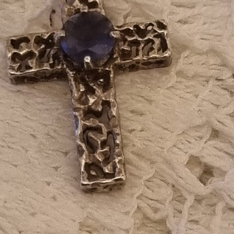 smykke, kors, sølvkors, anheng, lilla stein, smykker dame, korskjede, gave, vintage smykke, trendy smykke, brukt smykke, kristent kors, motesmykke, tilbehør