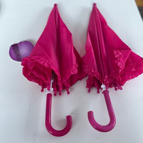 To barnparaplyer i grønn og hvit farge. Den grønne paraplyen har froskedesign med øyne på toppen og frosker på stoffet. Den hvite paraplyen er enkel uten mønster. Begge paraplyene har håndtak tilpasset barn. Selges samlet kr 20.