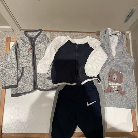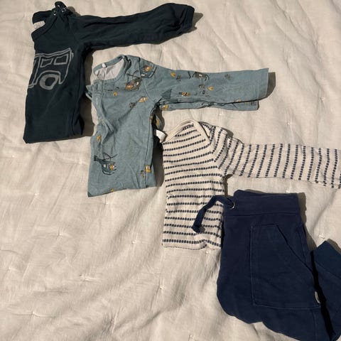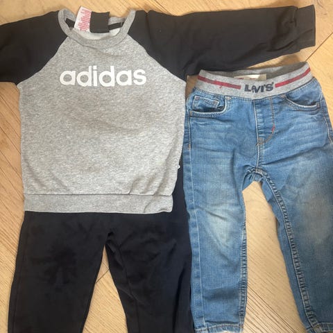 Adidas barneklær for gutt i størrelse 74. Settet inkluderer en genser og bukse i grå farge med blå detaljer. Materialet er mykt og egnet for små barn.
