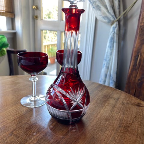 Vintage Bohemia Crystal Ruby Red karaffel og 3 glass