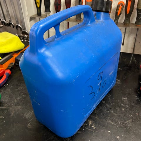 Brenderup bensinkanne med kapasitet på 5 liter. Laget av grønn plast. Egnet for oppbevaring og transport av bensin.