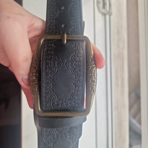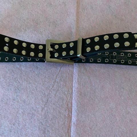 Skinnbelte for dame i svart farge med dekorative nagler og metallspenne. Beltet har flere hull for justering av størrelse.