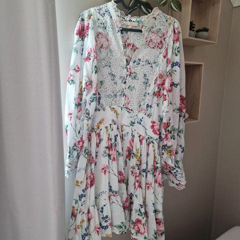 byTiMo lekker kjole i størrelse L for dame, laget av bomull. Kjolen har flerfarget mønster med detaljer i hvitt og blått, og har lange ermer med dekorative blonder og broderier.