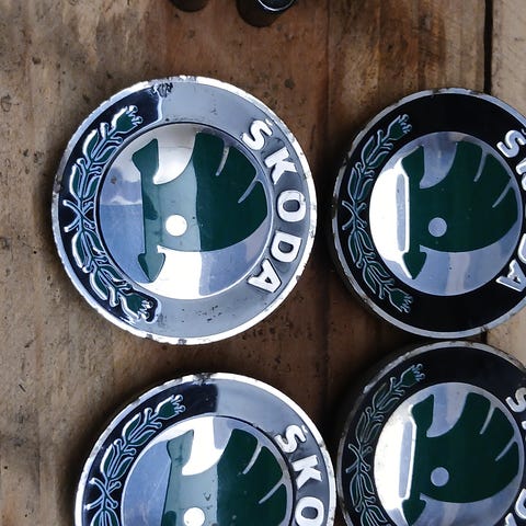 Skoda felgdeksel sett bestående av fire deler. Passer til hjul og brukes som dekorative deksler på felger. Farge: svart med sølvfarget logo.