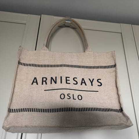 Arnie Says totebag. Vesken er laget av stoff og har et enkelt design med logo på forsiden, håndtaket er stivt. Nesten ikke brukt, er ikke i salg i butikk lengre.